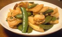 塩こしょうし、バターで焼いたスナップえんどう 筍 ほたてを酒蒸し 最後に醤油を入れ 味を整える。