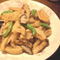 掘りたてを、煮竹輪 しいたけなどと煮て スナップえんどうを散らした。