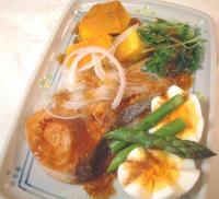 醤油 味噌 砂糖 みりん適宜 酢少々 しょうが汁のタレに鰆を10分ほどつけ、フライパンでキツネ色に焼く。蒸しかぼちゃ 茹でた水菜 アスパラ 卵 新玉ねぎを添え、鰆を盛り付けたあと、フライパンにタレを入れ 煮立て かける。