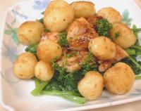 小松菜は、塩こしょうで炒めお皿に敷き、最後に じゃがいも 鶏肉とあわせ、細かく切ったパセリをかける。