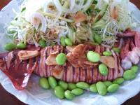 ?焼けたら出し、残った汁にさらに酒・醤油を適宜入れ、少し煮詰めて しょうがをいれ、イカ 野菜にかける。