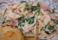?バターと同じくらいの量の小麦粉を ?に入れ 炒め、それに牛乳を加え なめらかになるまで 混ぜながら 熱し 塩で 味を調え 最後に茹でたほうれん草を加える。