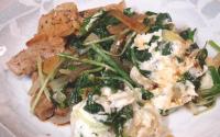 ?ほうれん草など野菜を塩こしょうで炒め、最後に大和芋をすったものを入れ 醤油で味付けし 焼いた肉にかける。