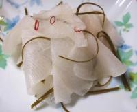 大根を薄切りし、塩にしたあと 水を出し、酢・みりん・タカのつめ