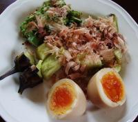 おかか焼きナスとおくら 煮卵添え