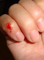 つばをつけてちちんぷいのぷいと笑っておしまいというところだが年齢が年齢なので、すりむいた両膝と手首と指(写真)の四箇所に消毒をした。