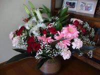 花かごのほうは、前日 花屋さんにあった花の中から選び家で活けた。