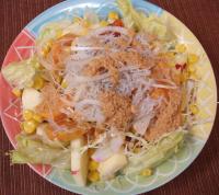 買い物に行く時間がなくて(気力も)、夫とふたりだけの昼食・・残り物でいいよと夫は言ってくれてたので、その通り あるものを総動員したサラダ。