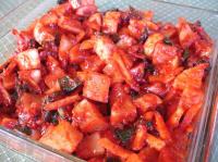 ?水を切り しばらく置いたものに、にんにく・りんごの千切り・キムチ漬けの素をいれ、よく混ぜ 数日置く。